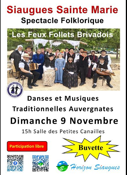 Danses et musiques traditionnelles auvergnates Évènement culturel en lien avec le patrimoine local Au programme gigues, bourrées et crouzades aux sons des instruments traditionnels Dimanche 09 novembre 2025 à 15 H. à Siaugues Sainte Marie Salle des petites canailles